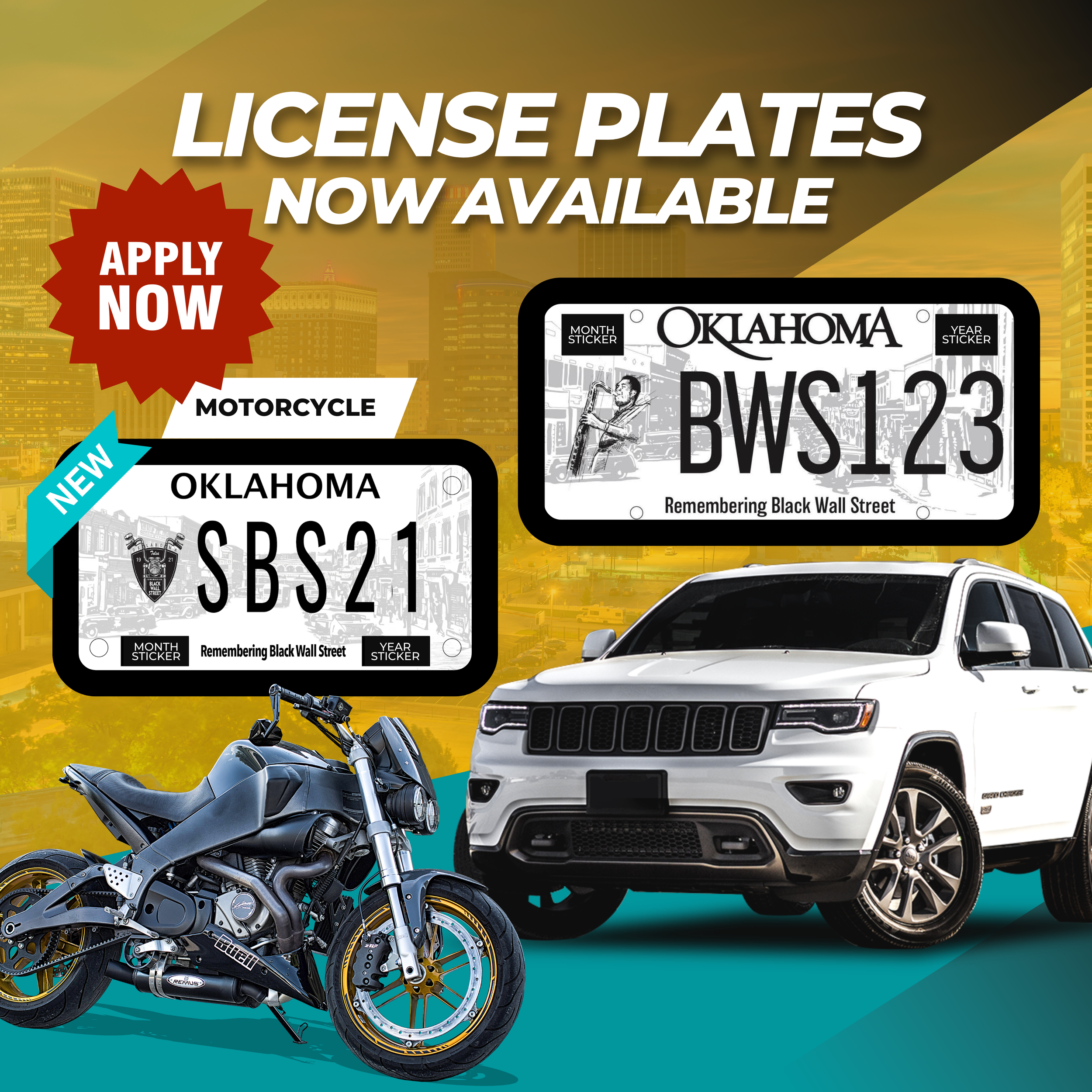 The Historic Greenwood District “Remembering Black Wall Street” license plate is now easier to obtain than ever. It also serves as the standard Oklahoma license plate, so you no longer need to purchase both a standard plate and a specialty plate separately!